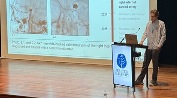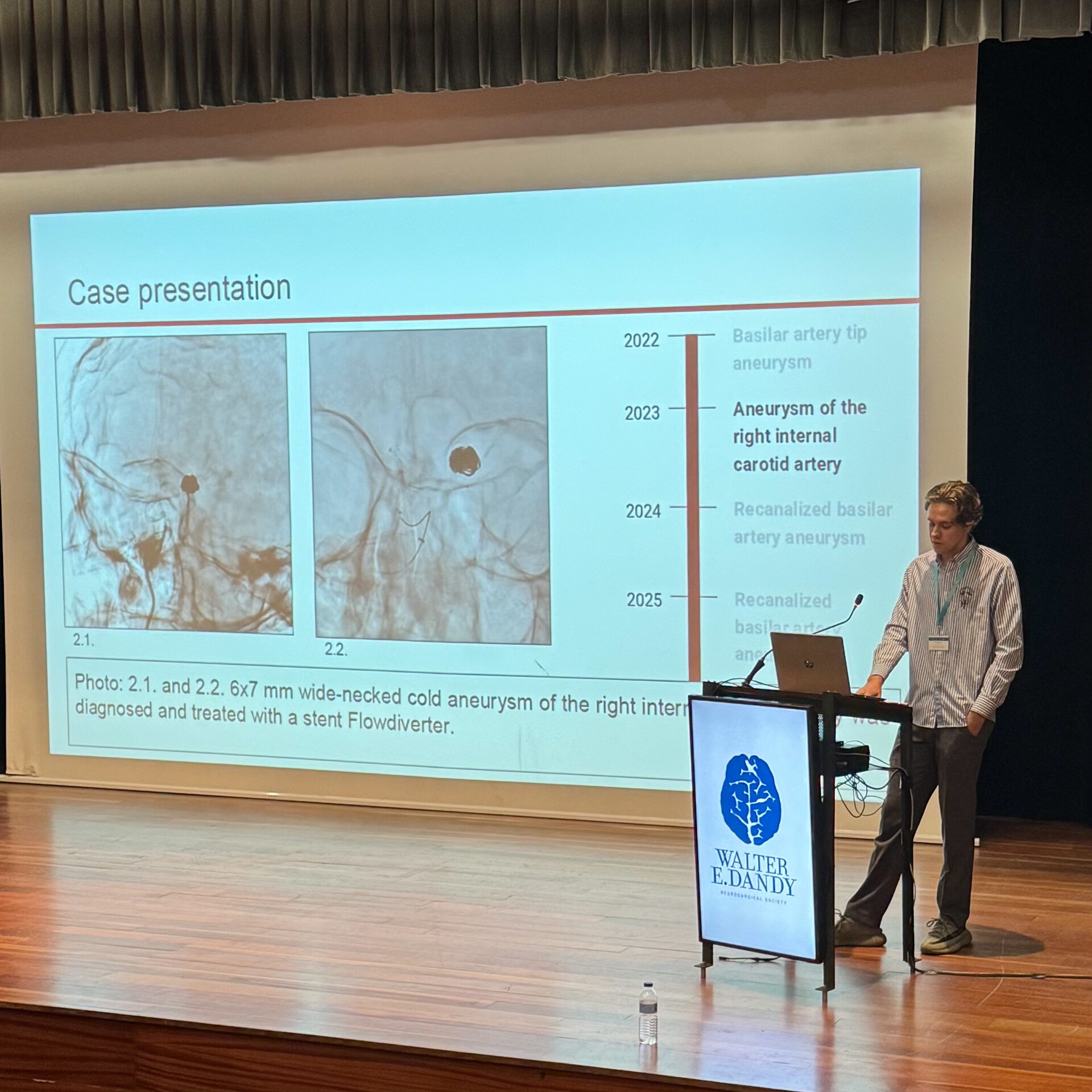 Przedstawili też wyniki dwóch prac naukowych realizowanych w ramach działalności Studenckiego Koła Naukowego Neurochirurgii. Tomasz zaprezentował pracę pt. „Preoperative embolization in preparation for meningioma resection: a case series” podczas sesji plakatowej, natomiast Bartosz — pracę pt. „Recanalization and recurrence after endovascular treatment of wide-necked cerebral aneurysms: a case report and clinical insight” w ramach sesji ustnej.