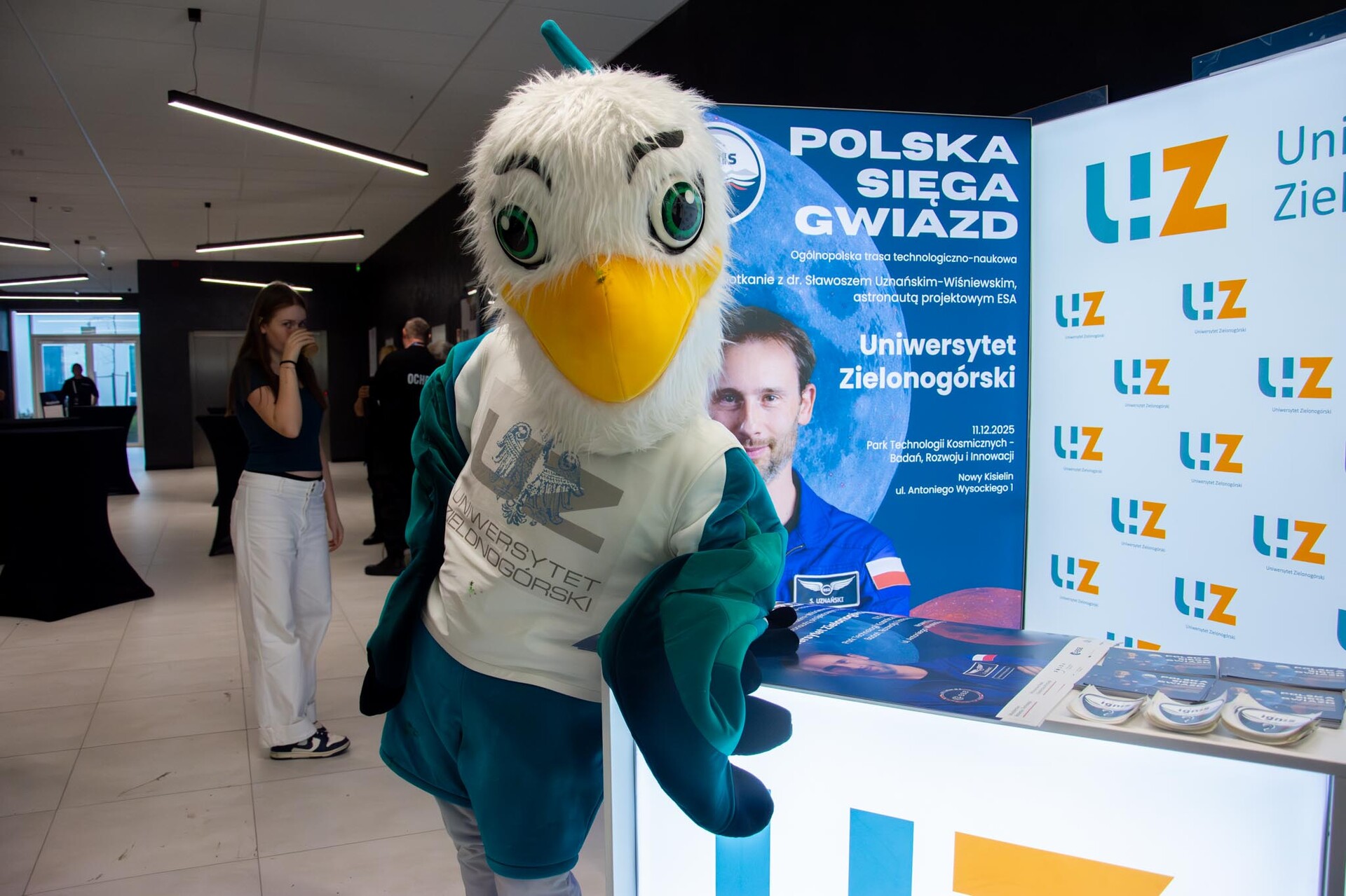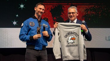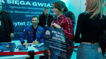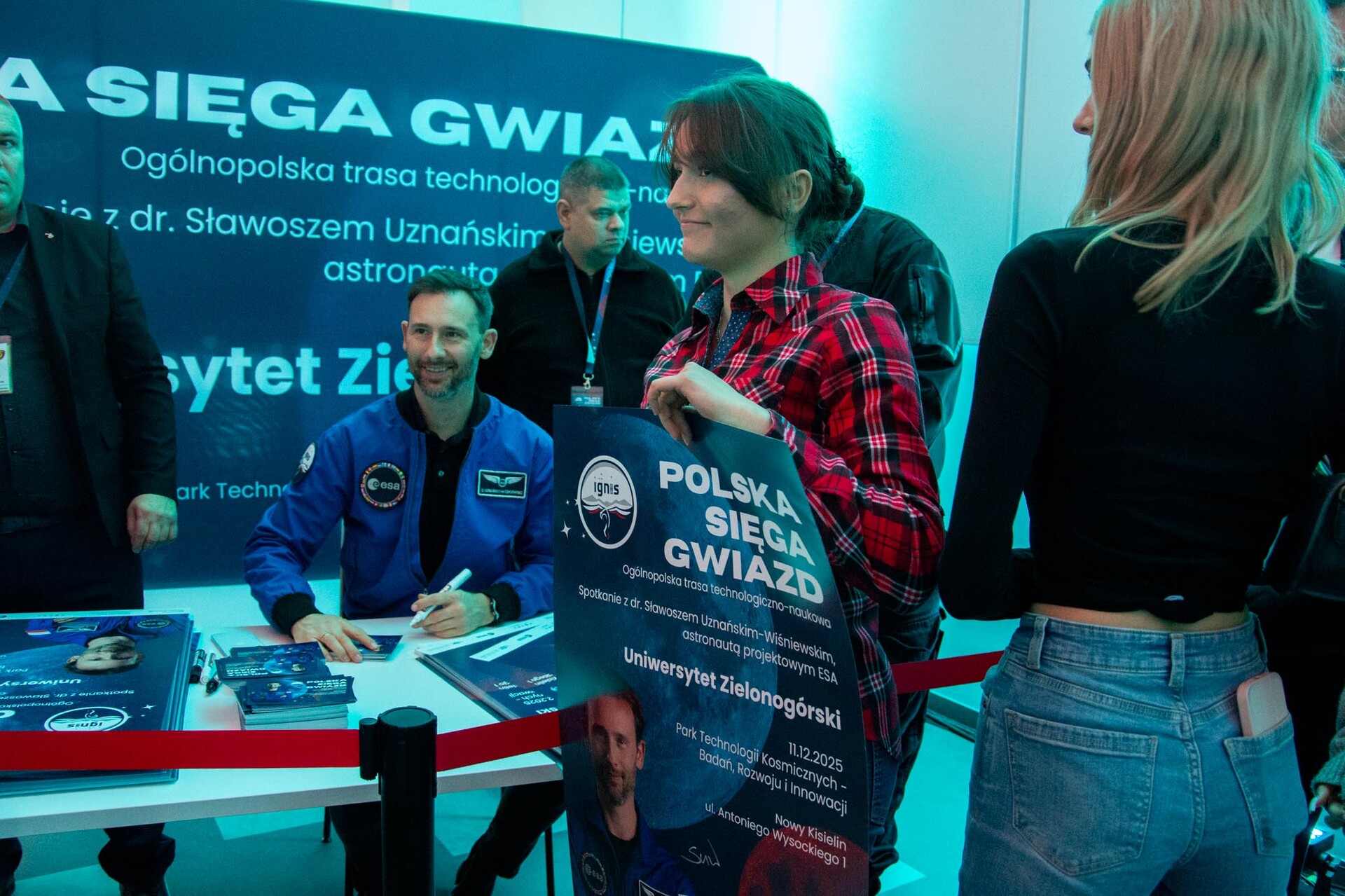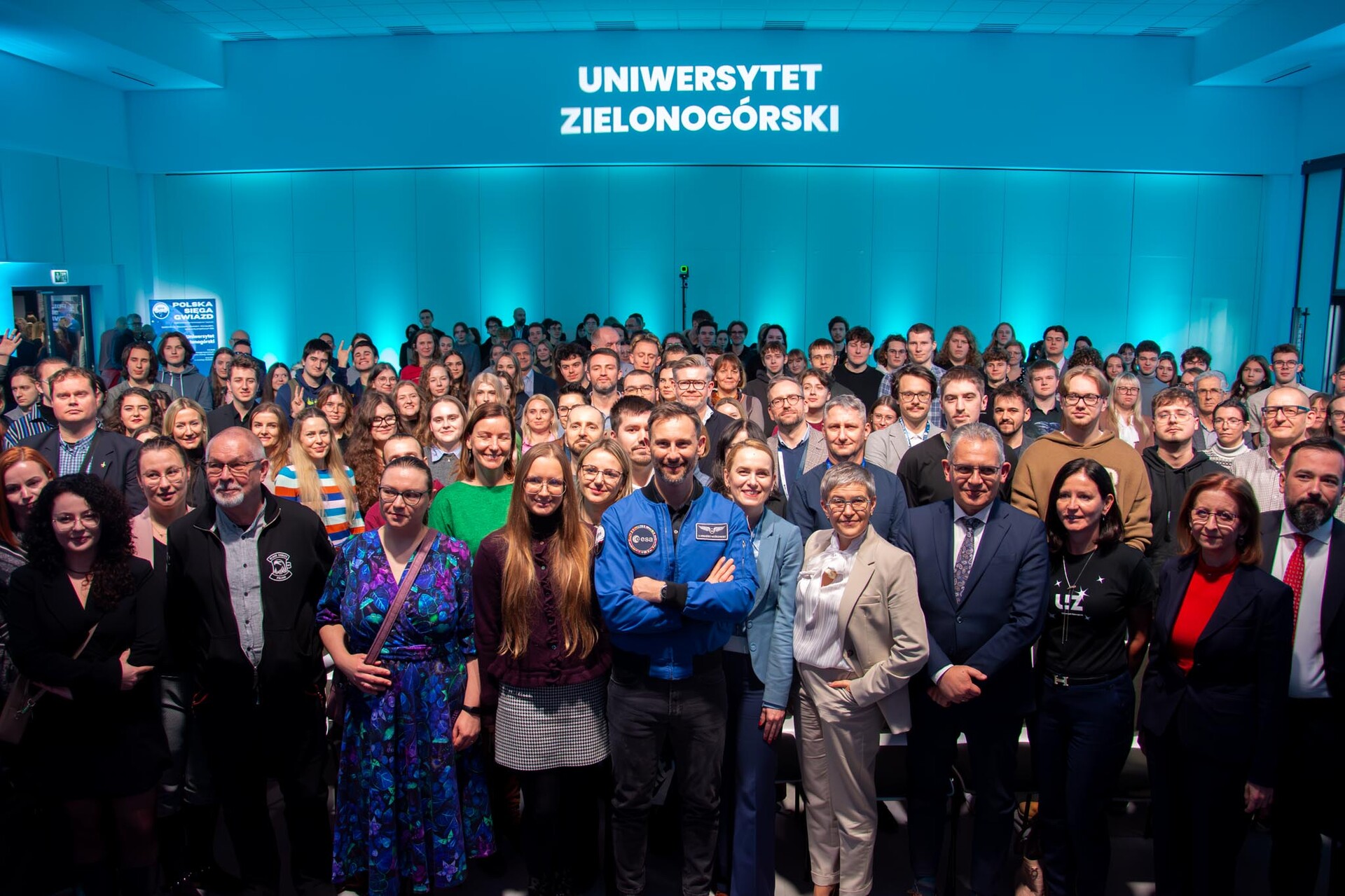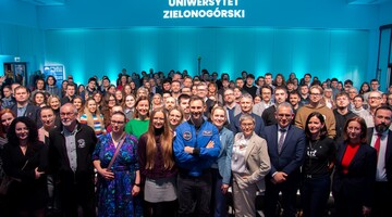 11 grudnia br. przeżyliśmy wspólnie wiekopomny moment. Zieloną Górę odwiedził bowiem Sławosz Uznański-Wiśniewski - astronauta projektowy Europejskiej Agencji Kosmicznej (ESA). Spotkał się on ze społecznością akademicką, uczniami szkół podstawowych i ponadpodstawowych oraz przedstawicielami władz uczelni i regionu. Zapisy na wydarzenie zostały wyczerpane z prędkością światła. Wiele osób chciało zobaczyć człowieka, który zapisał się na kartach historii jako drugi Polak, który poleciał w kosmos. Ci, którzy nie mogli uczestniczyć w wydarzeniu osobiście, śledzili jego przebieg online dzięki transmisji.