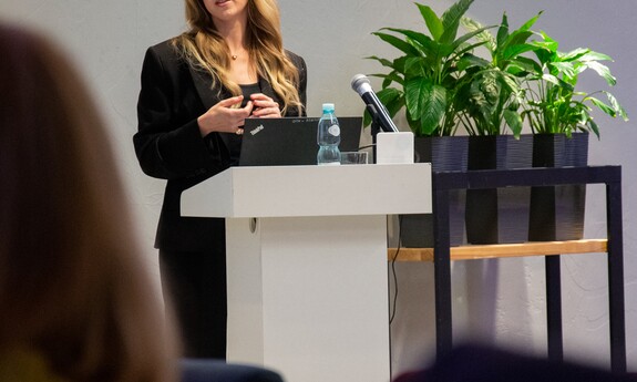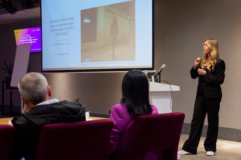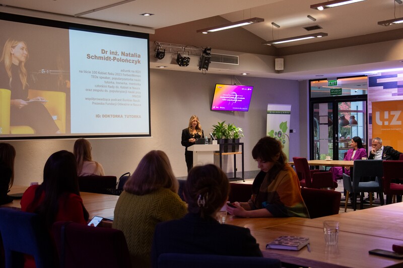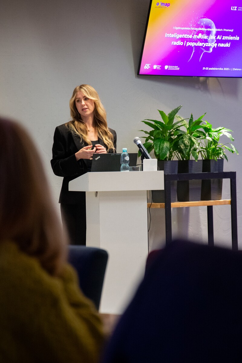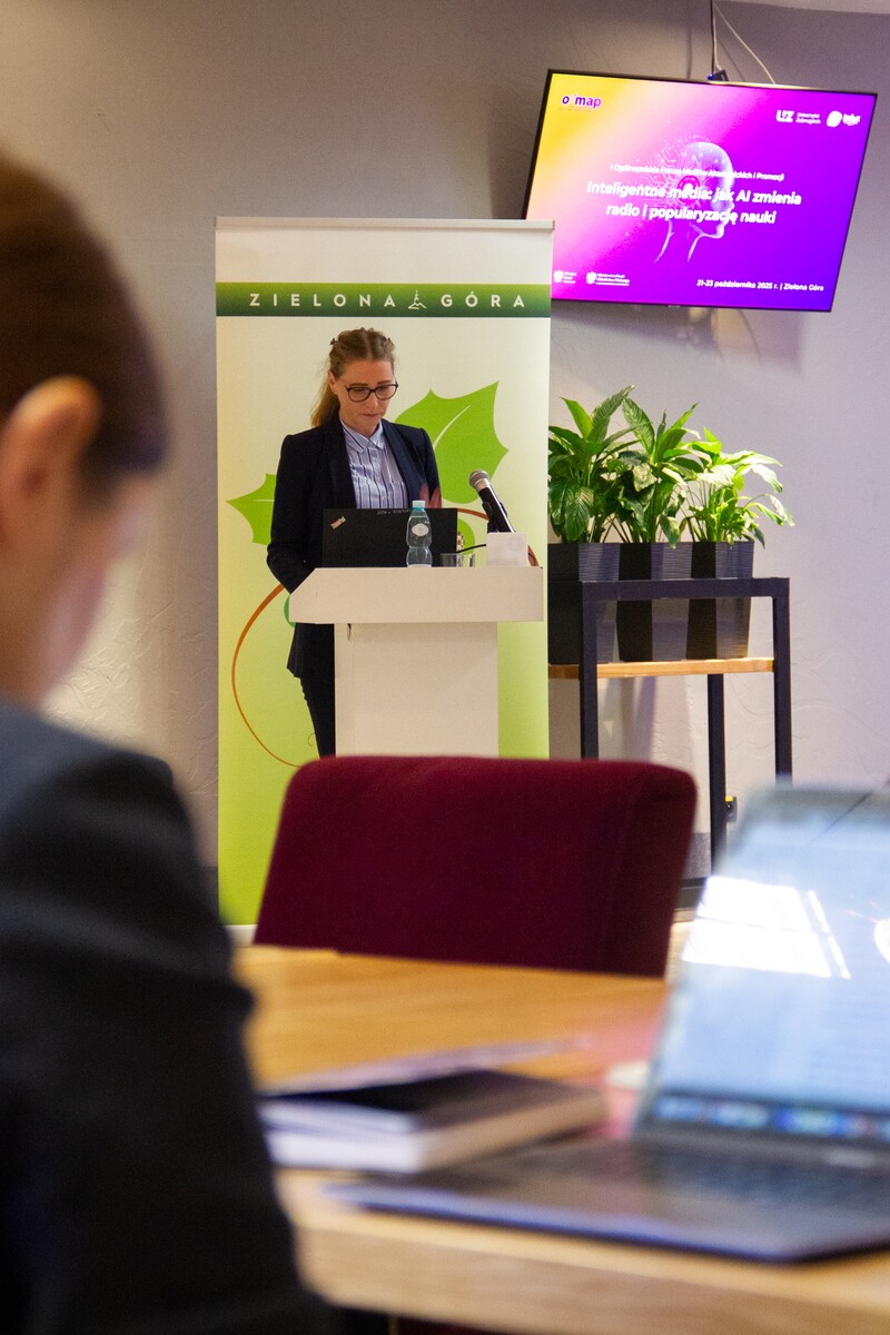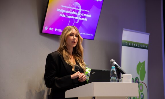Ostatni wykład tego dnia wygłosiła dr inż. Natalia Schmidt-Polończyk (znana jako @doktorka_tutorka) z Akademii Górniczo-Hutniczej im. Stanisława Staszica w Krakowie. W wystąpieniu pt. „Rola podcastu w promocji nauki” – jak sama nazwa wskazuje – prelegentka przedstawiła znaczenie podcastu w popularyzacji nauki na podstawie własnego doświadczenia jako prowadząca „Bunkier Nauki”. Co ciekawe, jak do tej pory AI nie znalazło zastosowania w tworzeniu tego popularnego podcastu. Całą produkcją materiału zajmują się tylko i wyłącznie ludzie. Dr inż. N. Schmidt-Polończyk podkreśliła, że aby skutecznie dotrzeć do szerokiego grona odbiorców, o nauce trzeba mówić na luzie, z dystansem i prostym językiem. Przy doborze tematów warto kierować się bieżącymi wydarzeniami, trendami czy najnowszymi badaniami, a takie inspiracje i kontakty można łatwo znaleźć w sieci. Warto również pomóc naukowcom wyjść z cienia ze swoimi badaniami i otworzyć się na występy medialne. To właśnie oni, wykorzystując swoją specjalistyczną wiedzę przełożoną na zrozumiały dla wszystkich język, mogą odegrać kluczową rolę w edukowaniu społeczeństwa i zachęcaniu młodzieży do dalszego kształcenia się.