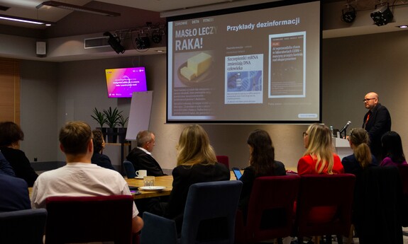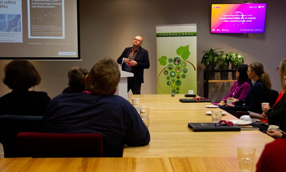 Następnie płynnie przeszliśmy do sposobów weryfikacji źródeł i nieuleganiu fałszywym informacjom, o czym dowiedzieliśmy się z wykładu prof. Pawła Walczaka z Instytutu Filozofii UZ pt. „Jak walczyć z fake newsami i dezinformacją naukową w mediach społecznościowych i nie tylko?”. Prof. P. Walczak mówił o potrzebie zaprzestania zaciekłej walki z innymi poglądami i rozpoczęciu konstruktywnej dyskusji, próbie zrozumienia drugiej strony oraz wypracowaniu krytycznego myślenia. Kluczowa jest bowiem analiza, rozsądne podejście do każdej informacji, sprawdzenie jej w wielu źródłach, spojrzenie z różnych perspektyw, a następnie wyciąganie logicznych wniosków i podejmowanie świadomych decyzji. Nie powinniśmy bowiem zamykać się na świat i szufladkować, ale też nie możemy dać się zmanipulować. Patrząc z punktu widzenia marketingowca czy dziennikarza, również trzeba tworzyć wiarygodnie, zgodnie z tematem i faktycznym stanem rzeczy. Niepokojące i nieco zaskakujące jest także zjawisko utraty zaufania do naukowców wśród społeczeństwa. Naukowcy przestają być autorytetami, a ich błędy są źle postrzegane, mimo, że leżą w ludzkiej naturze i dają pole do rozszerzenia badań. Trzeba zatem próbować budować wiarygodny, ekspercki wizerunek uczelni i samych naukowców w jak najbardziej przystępny i bliski odbiorcom sposób.