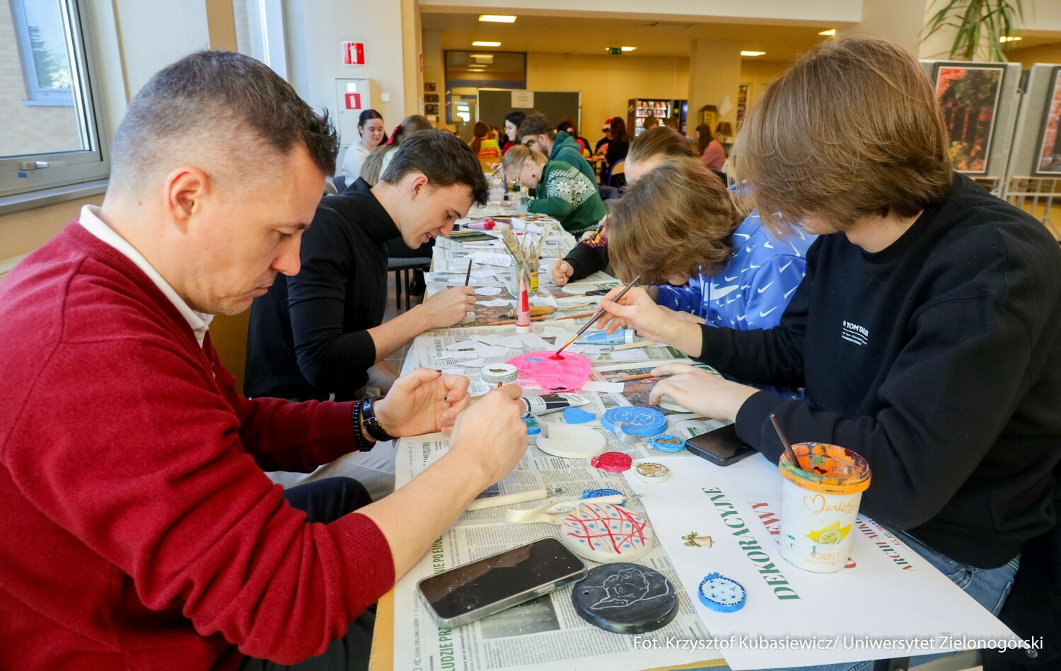 Koło Naukowe Animacja UZ zaprosiło na wydarzenie ph. „Coraz bliżej święta”, które stało się już coroczną tradycją na Kampusie B. Uczestnicy wspólnie wykonali ozdoby świąteczne, śpiewali kolędy, a nawet tańczyli. Można było również zrobić sobie pamiątkowe zdjęcie na specjalnej ściance. Nie zabrakło charytatywnego akcentu – studenci przygotowali kartki świąteczne dla seniorów: Zdarza się, że są samotni w święta i chcemy dać im znać, że ktoś o nich pamięta. Co roku staramy się zaszczepiać we wszystkich ten świąteczny klimat – wyjaśniła Julia Juś - studentka animacji kultury i twórczej aktywności w sieci.