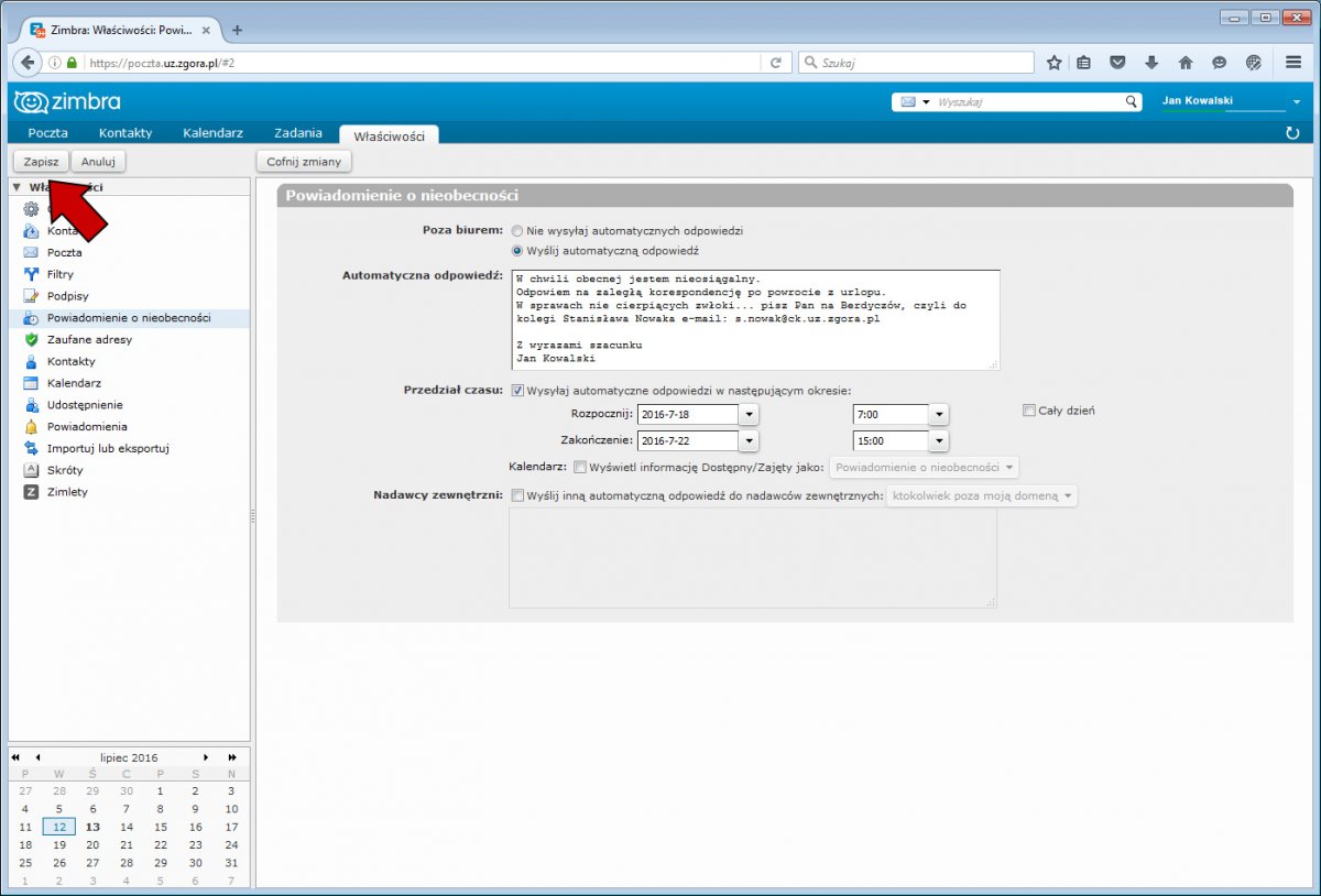 Ostatnim krokiem, który należy wykonać aby ustawić opcję automatycznej odpowiedzi jest zapisanie ustawień. Odpowiedni przycisk [Zapisz] znajduje się z lewej strony pod górnym menu z opcjami systemu Zimbra. Od tego momentu każdy nadawca, który w określonym przez nasz okresie wyśle na naszą skrzynkę jakąś wiadomość, zostanie powiadomiony o tym, że otrzymaliśmy od niego wiadomość i jednocześnie otrzma zdefiniowaną przez nas treść autorespondera.