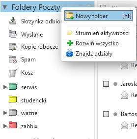 Tworzenie nowego folderu w systemie pocztowym. Aby utworzyć nowy folder należy kliknąć prawym przyciskiem myszy na napis „Foldery poczty”. Następnie wybieramy opcję: „Nowy folder”. W okienku dialogowym w polu nazwa podajemy nazwę kojarzącą się z filtrem który utworzymy np. Wnioski.